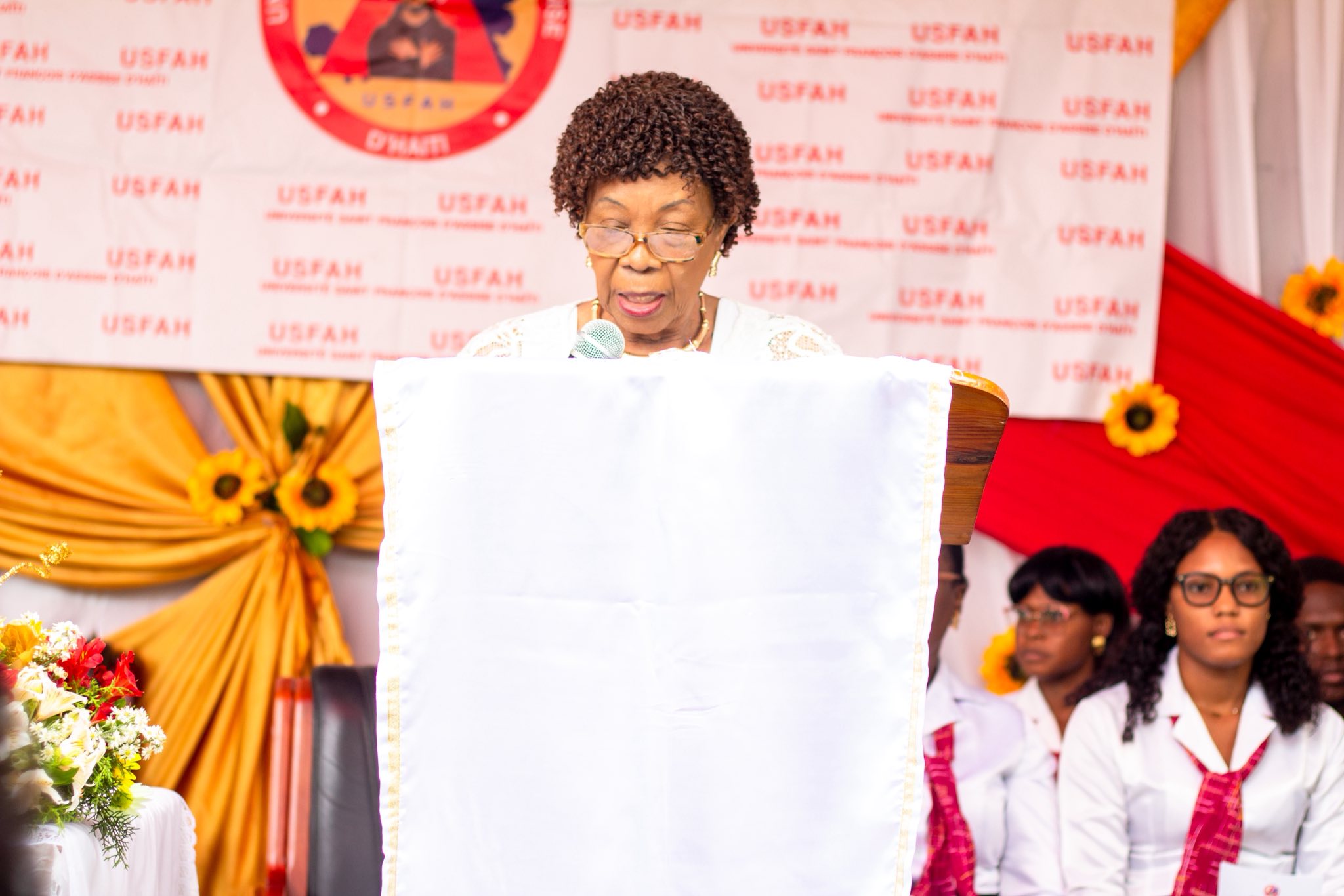 À l’appel du maître de cérémonie, M. Dieulique Klaus Marechal, la secrétaire générale de l’USFAH et doyenne de la Faculté de Médecine et des Sciences de la Santé (FMSS) du Nord Dr. Gréta Roy Clément, a pris la parole pour détailler le programme de médecine du campus nord. Elle a présenté ce programme comme un projet novateur pour la formation médicale en Haïti, et a présenté le personnel du décanat, dont l'expérience et la compétence sont les piliers du développement académique de l'USFAH.